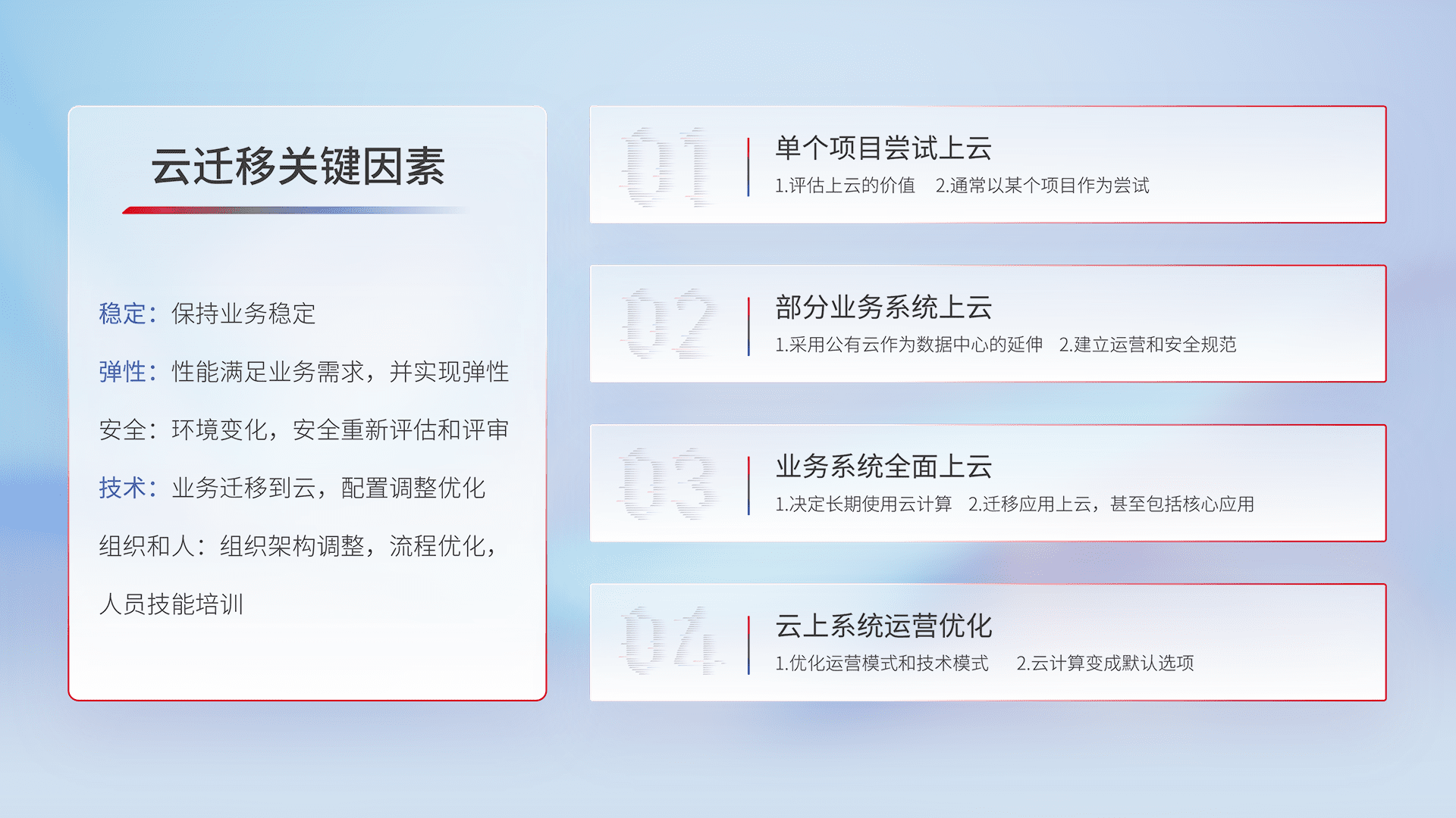 结合实际业务,,从规划设计、、云平台选型、、云原生改造、、、数据迁移、、集成交付,,,,迁移全过程为客户识别最佳上云路径,,,,做好风险识别管理,,,,设计网络架构、、、、身份权限、、、安全审计合规、、操作审计、、日志审计、、、、监控告警策略、、多站点容灾设计等,,对云上基础设施进行整体规划,,提升IT治理水平,,以满足弹性、、、、高可用、、高性能的需求。。。