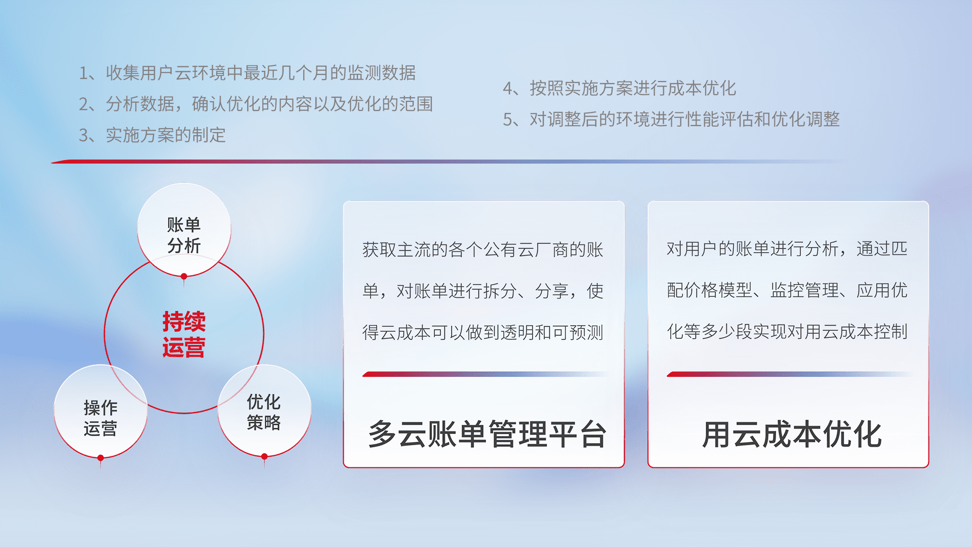 通过多云纳管,,,,以统一的资源数据模型把客户的云资源进行抽象和封装,,,,进而实现对多云资源的统一操作,,,保障云资源管理的可靠性、、稳定性与可用性。。。量身定制化运维内容,,配置、、开发运维、、补丁管理、、备份、、、、监控、、认证和访问管理、、、审计和日常巡检等,,,,保障在用云过程中的可靠度,,,,稳定度以及高可用率。。。。