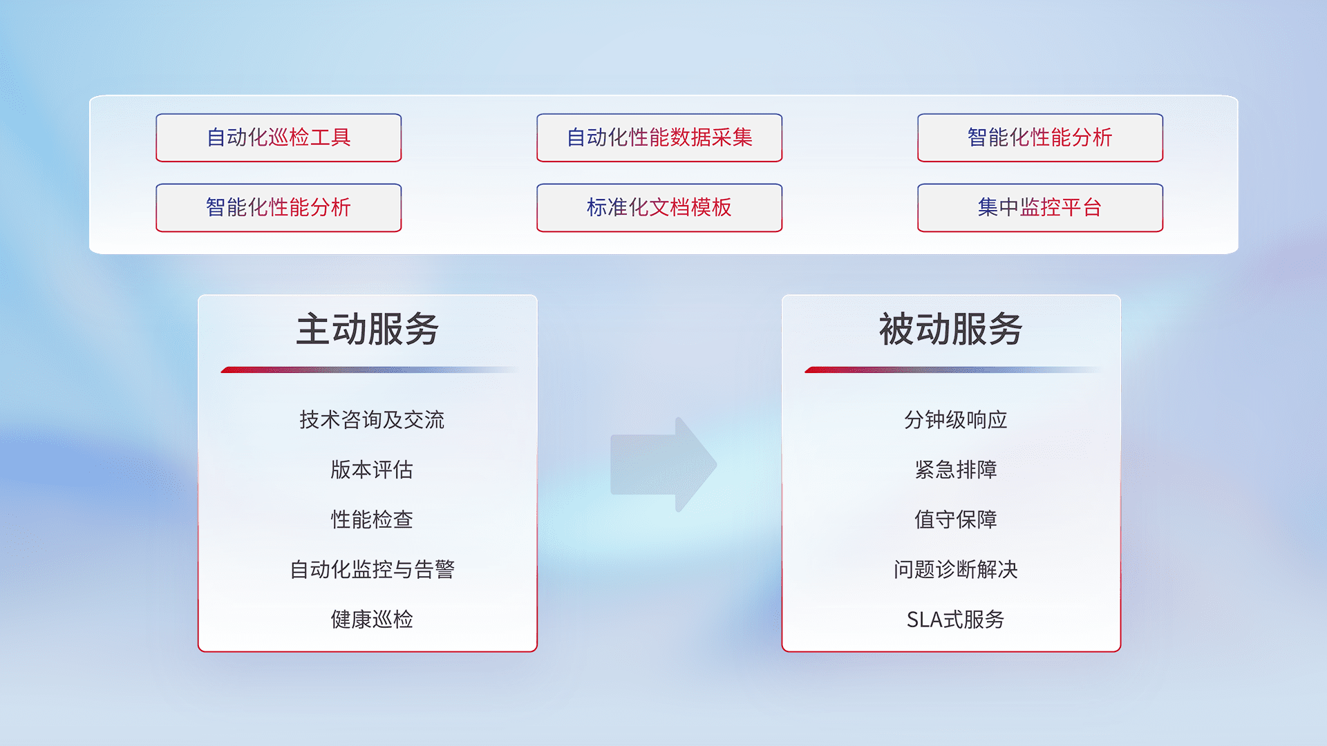 智能化工具和标准化文档,,,保障服务质量,,,提供主动服务(包含技术咨询、、版本评估、、、性能检查、、、、自动化监控与告警、、健康巡检)和被动服务包含(分钟级响应、、、、紧急排障、、值守保障、、、、问题诊断解决、、、、SLA服务)。。。